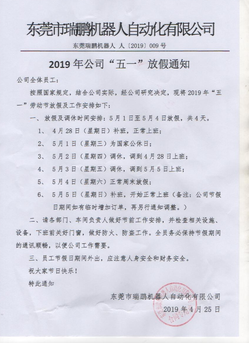 按照国家规定,结合公司实际,经公司高层探讨决定,2019年“五一”劳动节放假时间为:5.1-5.4放假四天,4月28号,5月5号正常上班。